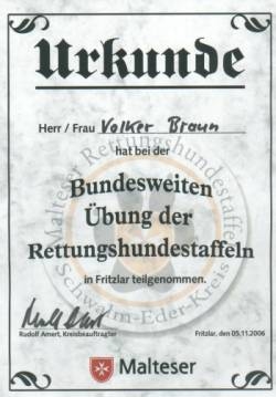Übung "Kalter Hund" Am 25. November 2006 fand die alljährliche Übung des Deutschen Roten Kreuz in Kassel statt, die allen unter dem Namen "Kalter Hund" bekannt ist. Da unsere Rettungshundestaffel auch zu Einsätzen nach Kassel und den Landkreis Kassel gerufen werden kann, haben wir uns über die Einladung sehr gefreut. Besonders gefallen hat uns die Begleitung eines "Schiedsrichters", der mögliche Schwachstellen aufzeigte. Der Tag hat uns gut gefallen, danke nach Kassel ! Bundesweite Übung der Rettungshundestaffeln Gern sind wir der Einladung der Rettungshundestaffel der Malteser Schwalm-Eder gefolgt, die zu einer Übung auf dem Bundeswehrgelände eingeladen hatte. Sogar das Fernsehen war vor Ort, um über das Geschehen zu berichten, so daß wir Frank und Volker in der Hessenschau sehen konnten. Vielen Dank an Peter für die Einladung und alle, die zum Gelingen beigetragen und uns einen schönen Tag beschert haben. Wir sehen uns hoffentlich zum einem Rettungshundeeinsatz im Schwalm-Eder Kreis.