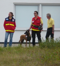 dem Unterordnungsteil durchsuchte jeder Hund innerhalb von 30 Minuten ein Gebiet von 75.000m² und entdeckte dort je 2 vermisste Personen. Für diese Leistung bekamen sie die Einsatzfähigkeitprüfung und dürfen nun in reale Einsätze gehen. Cleo mit Bentley ..........................................................und Michael mit Helfer Wilhlem und Prüfer Heinz