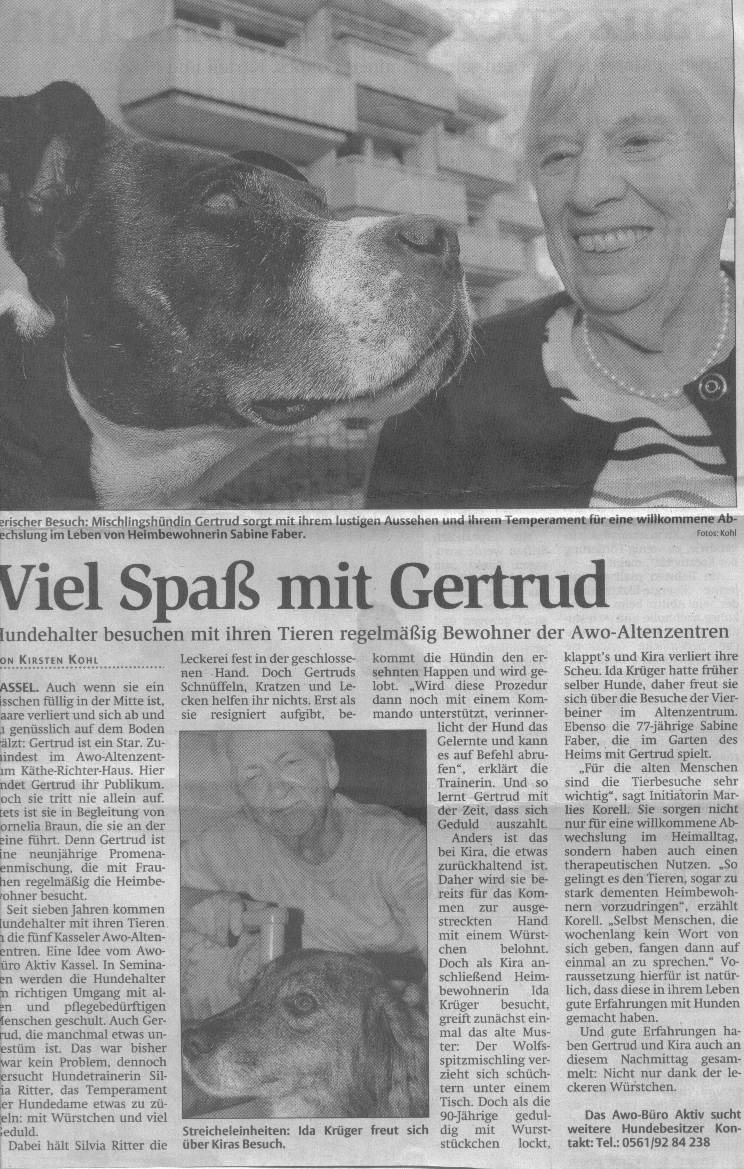 Anspruchsvolle Zweitaufgabe für Gertrud : Besuche im Altersheim Nicht nur als geprüfter Rettungshund in der Rettungshundestaffel in Hessisch Lichtenau steht Gertrud ihren Mann. Nebenbei besucht sie mit ihrem Frauchen alte Menschen im Altersheim in Kassel und fungiert somit als eine Art "Therapiehund." Die Nähe zu Kassel ist nicht willkürlich, schließlich erfolgen Einsätze unserer Rettungshundestaffel auch in Kassel und im Landkreis Kassel.