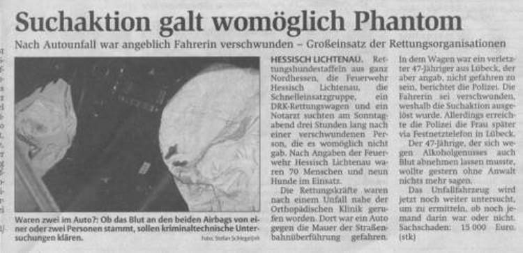 Über drei Stunden dauerte der vergeblich Rettungshundeeinsatz in Hessisch Lichtenau nach einer verwundeten Frau. Diese hatte - nach Angaben des verletzten Beifahrers - ein verunfalltes Fahrzeug gesteuert. Allerdings erreicht die Polizei die Frau später via Festnetztelefon in Lübeck. Nun ermittelt die Polizei, wer tatsächlich in dem Fahrzeug war. Der vermeintliche Beifahrer jedenfalls, der sich wegen Alkoholgenusses auch Blut abnehmen lassen musste, wollte ohne Anwalt nichts mehr sagen. Conny, Volker, Elke, Petra, Fabienne, eine"kopflose" Melanie und Alex um 01:30 Uhr